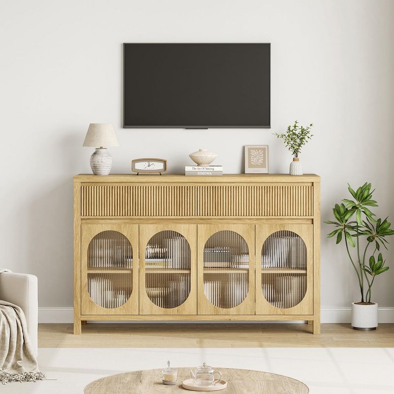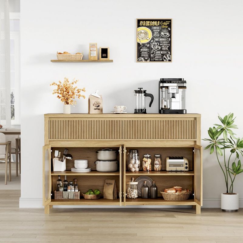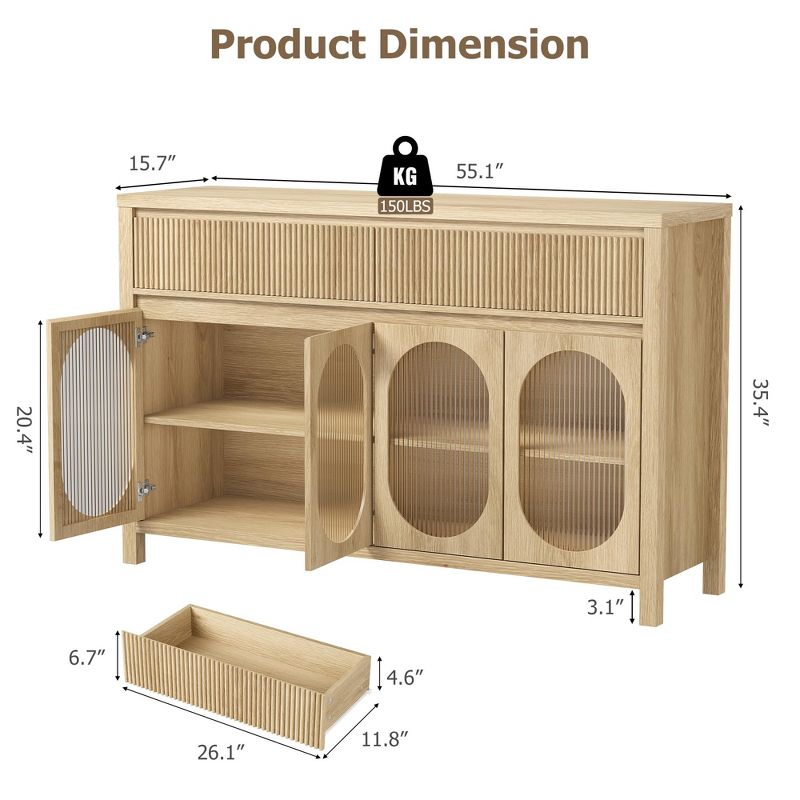 55" Large Buffet Cabinet with 4 Glass Doors & 2 Fluted Drawers - Storage Sideboard for Dining Room, Living Room, Kitchen Furniture