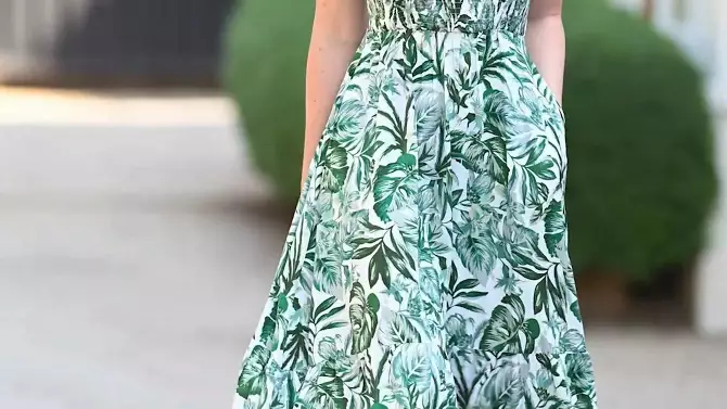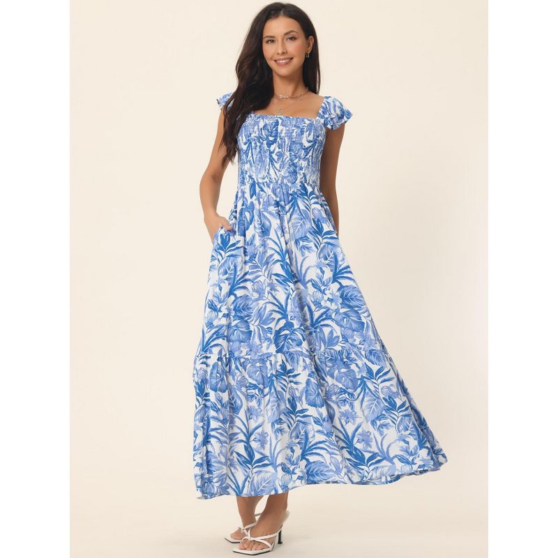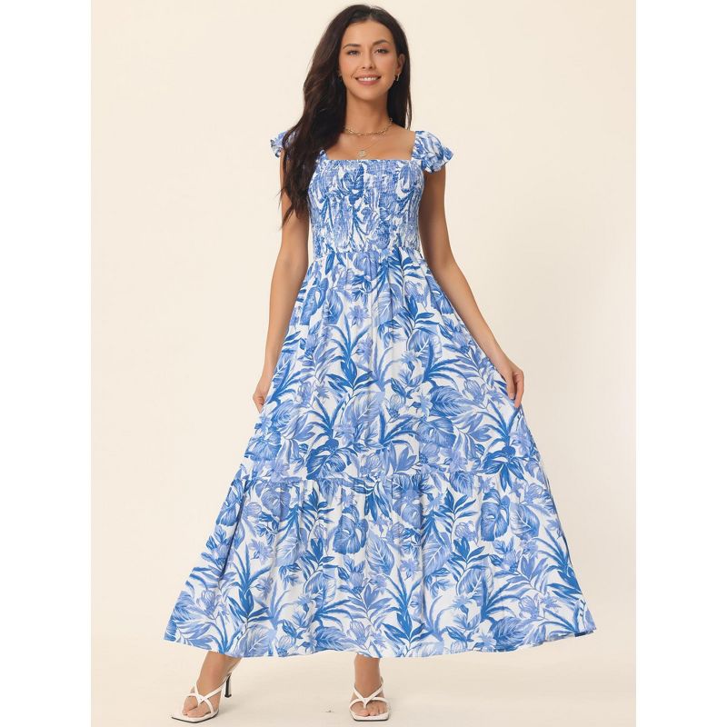 INSPIRE CHIC Women's Summer Boho Smocked Square Neck Cap Sleeve Ruffle Floral Flowy Tiered Maxi Sundress Blue Small