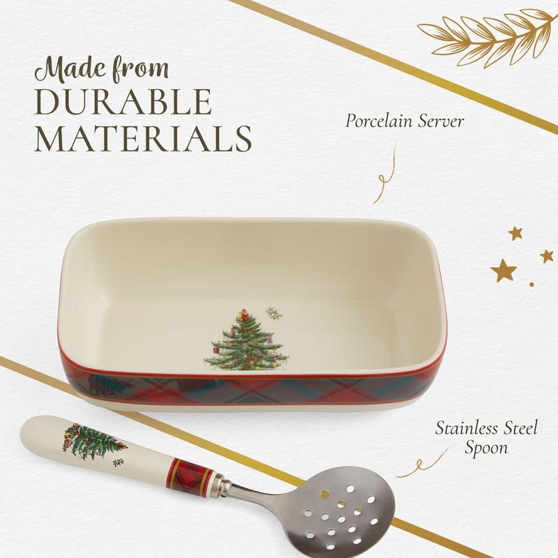 Spode Christmas Tree Tartan Cranberry Sauce Serving Dish with Slotted Spoon (8"x 4.25") - Server with Plaid Border - Dishwasher, Microwave Safe