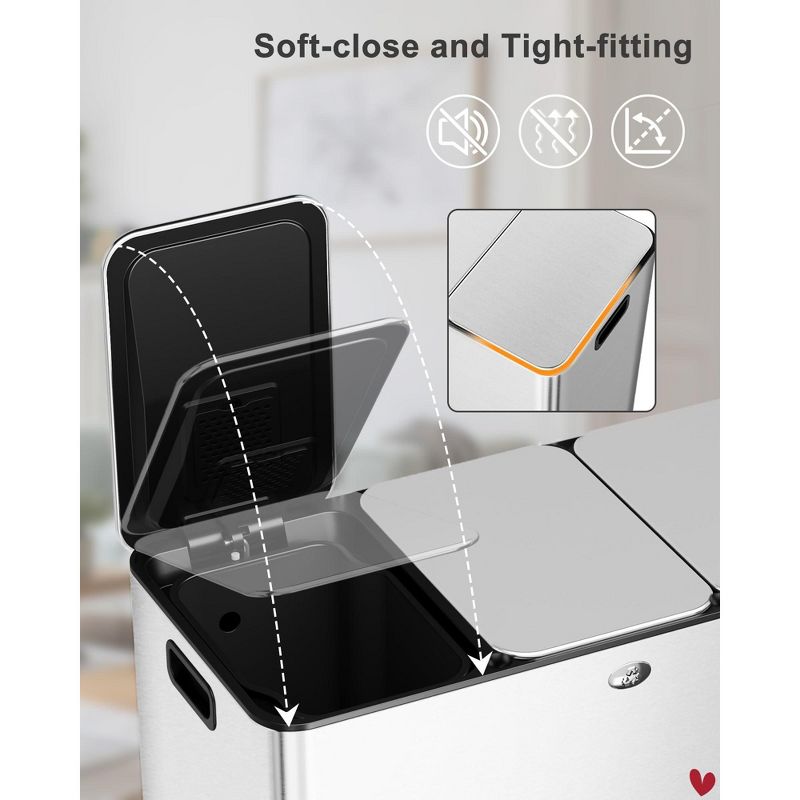 Trash Can, Garbage Can for Kitchen, Stainless Steel 3 Compartment Recycling Kitchen Step-On Garbage Bin with 3 Removable Inner Buckets