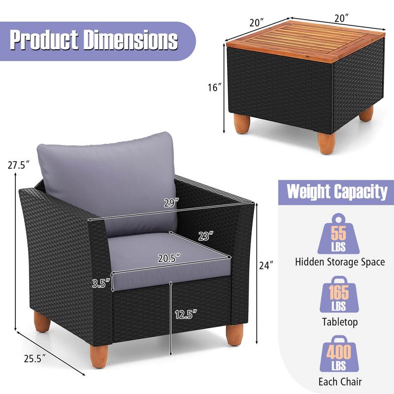 Costway 3 PCS Patio Rattan Furniture Set Cushioned Sofa Storage Table with Wood Top Grey