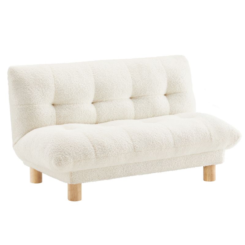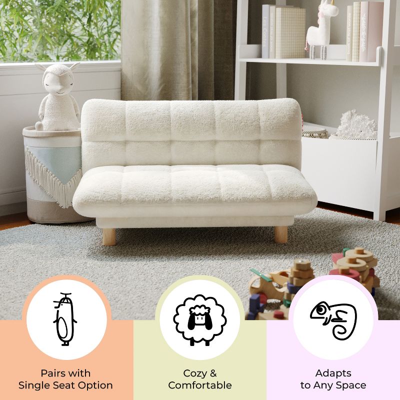 Buzz & Bloom Faux Shearling Cushioned Kids Couch with Tufted Seat and Back, Wood Legs in Marshmallow