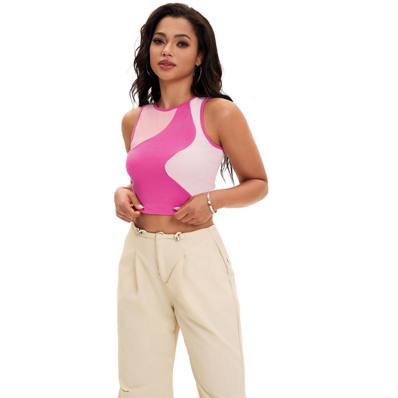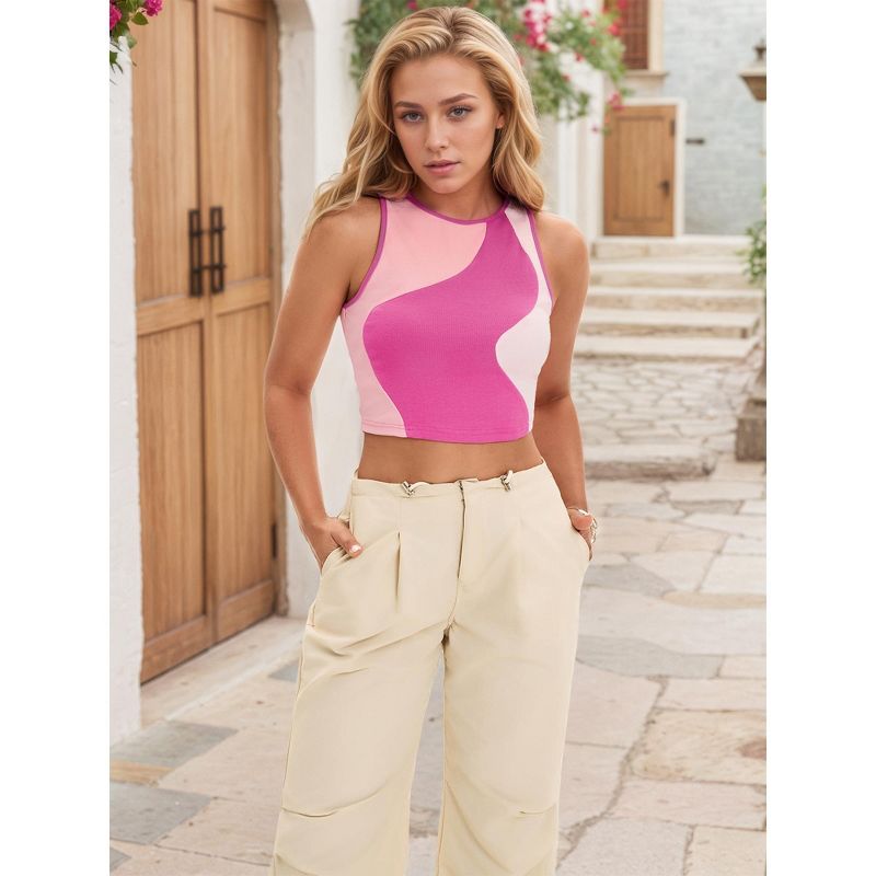 INSPIRE CHIC Women's Color Block Summer Crew Neck Ribbed Sleeveless Crop Going Out Tank Tops Pink Large