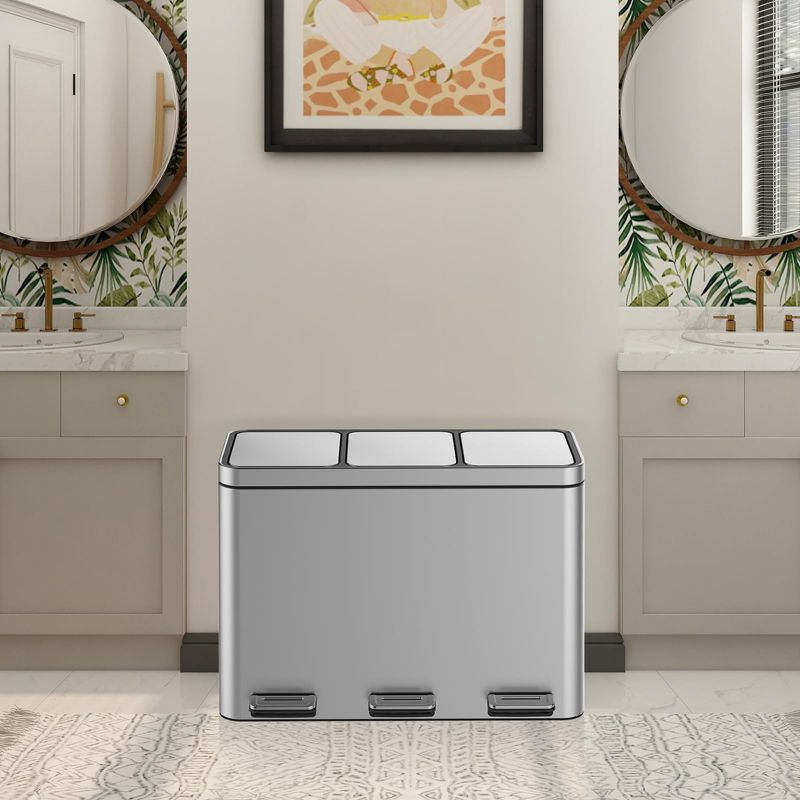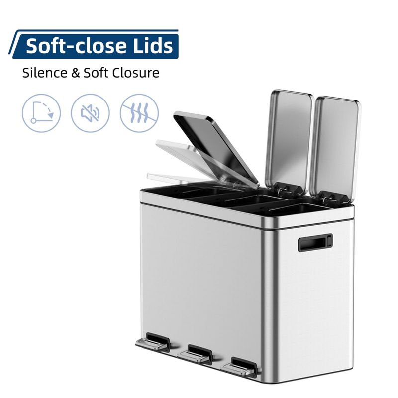 12-Gallon Stainless Steel Recycling Trash Can with 3 Compartments & Soft-Close Lid - Dual Waste Bins for Kitchen, Office - Fingerprint-Proof, 45L