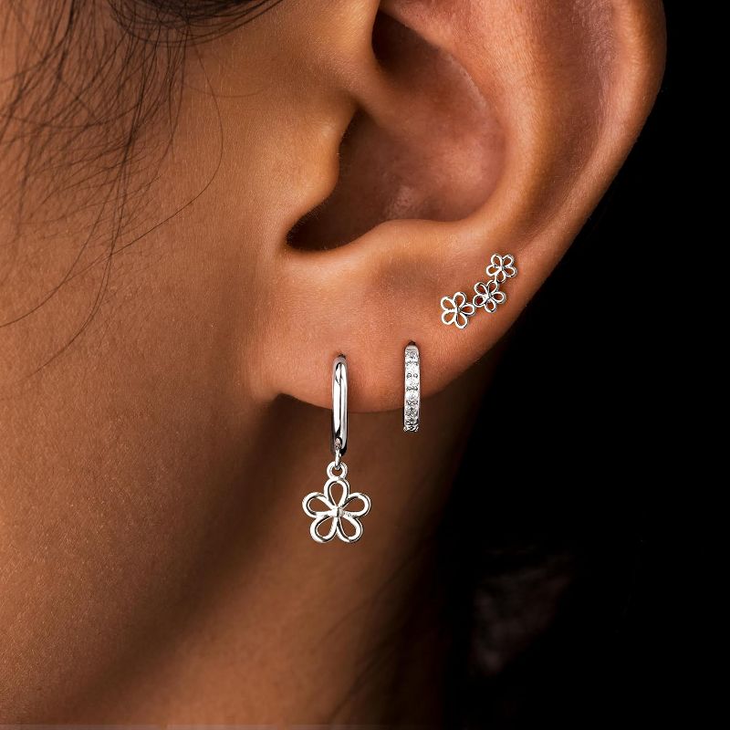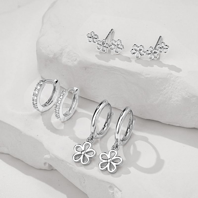 3-Pair Gold Plated Dangle Earrings Set: Seashell, Starfish & Cross Hoops for Multiple Piercings, Summer Gift Flower-Silver One Size