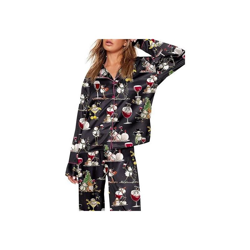 SHESHOW Satin Pajamas Set for Women Set Long Sleeve Button Down Pjs Sets 2 Piece Loungewear Animal Sleepwear Black XS