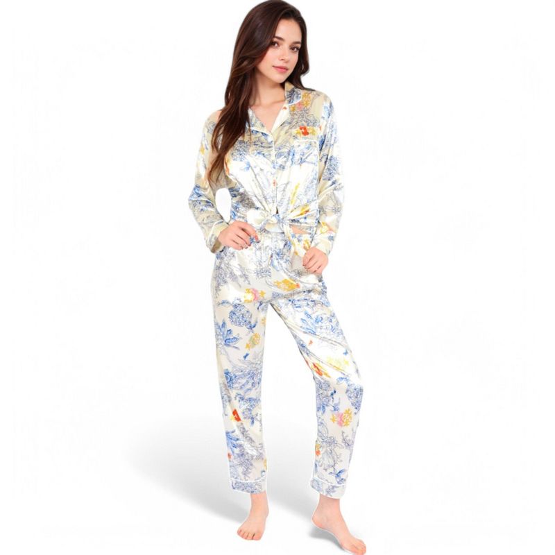 Anna-Kaci Lounge Women's Botanical Print Satin Pajama Set with Button-Up Top and Long Pants- Blue,Medium