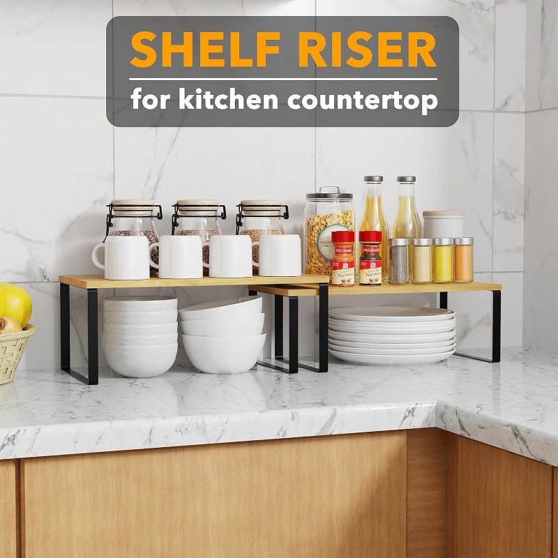 2-Pack Kitchen Cabinet Shelf Racks, Expandable Spice Rack for Pantry & Cupboard Storage, Black & Natural (Long)-SpaceAid