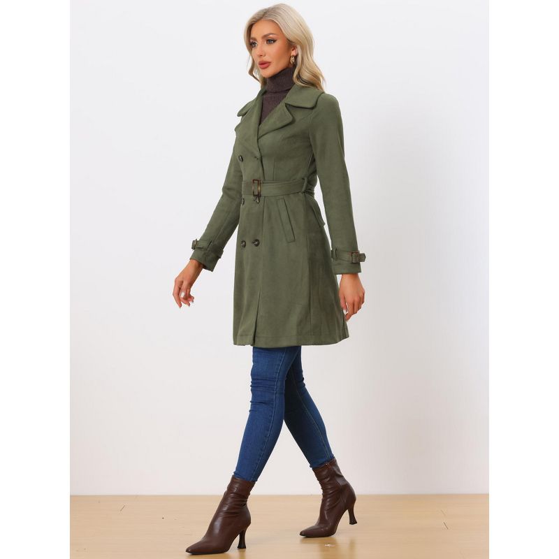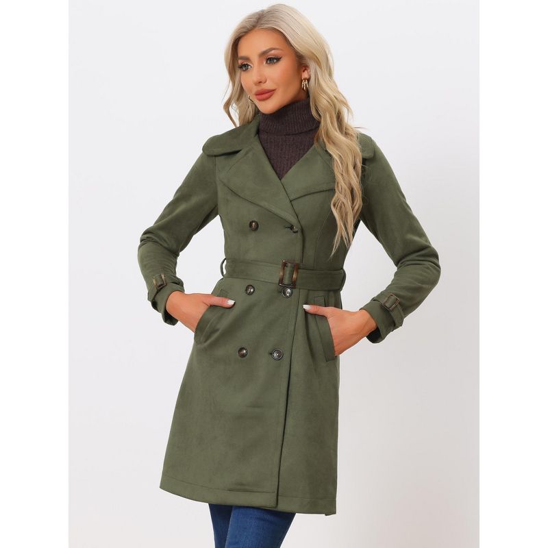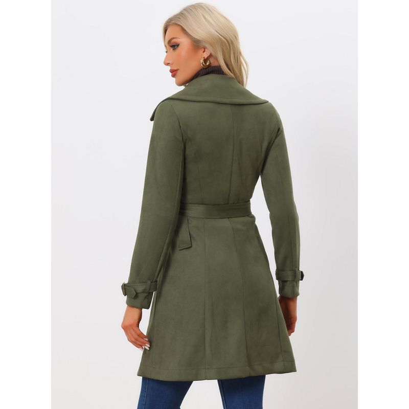 Allegra K Women's Faux Suede Notched Lapel Strap Cuff Solid Double Breasted Tie Belt Trench Coat Army Green Small