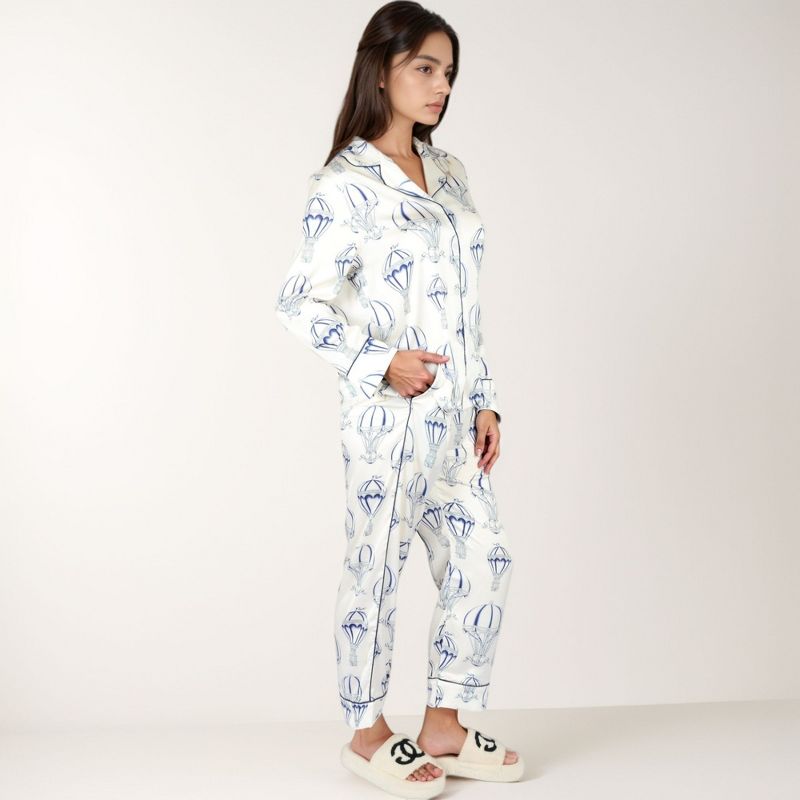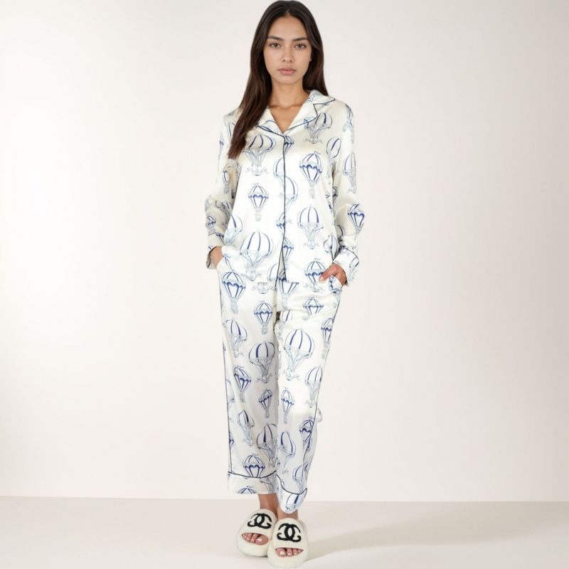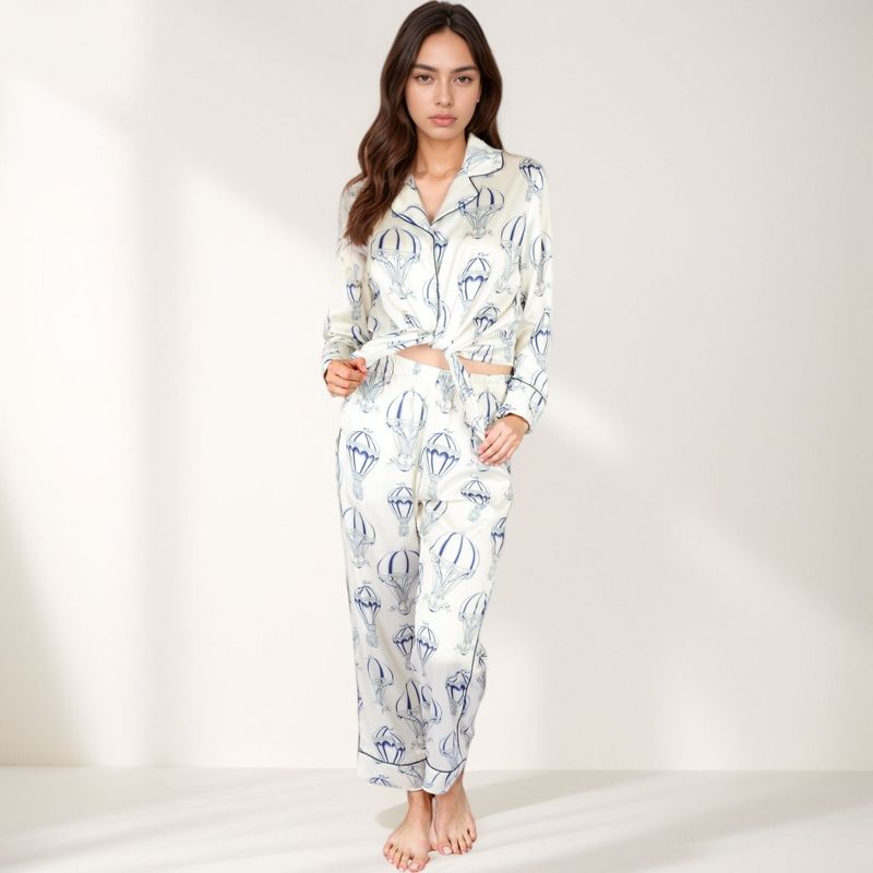 Anna-Kaci Lounge Women's Hot Air Balloon Print Pajama Set with Long Sleeve Button-Down Top and Cropped Pants - Small, White