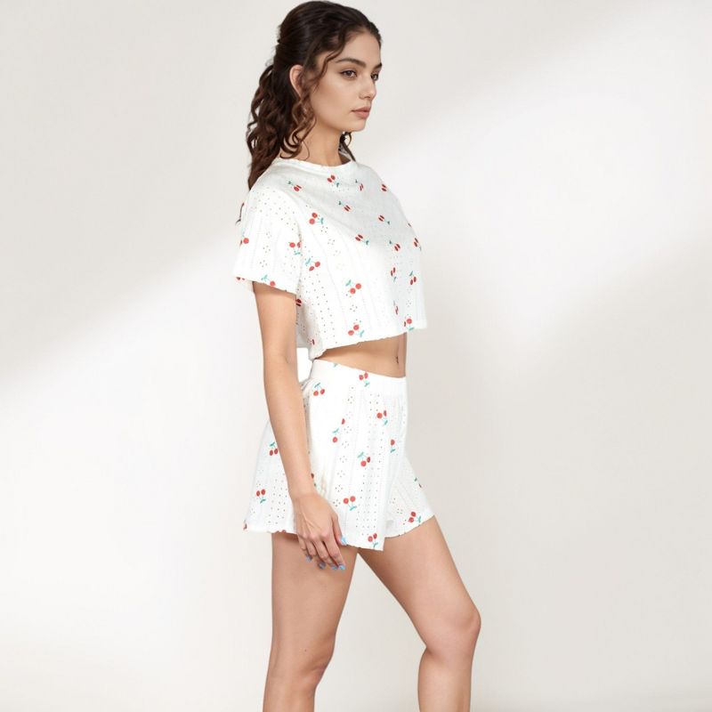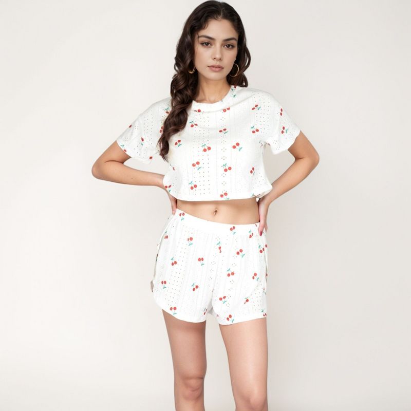 Anna-Kaci Lounge Women's Cherry Print Pajama Set with Cropped Short Sleeve Top and High Waist Relaxed Fit Lounge Shorts - Medium, White