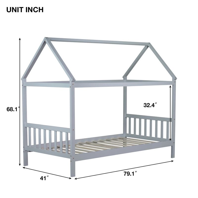 VASIP Gray Twin House Bed Frame - Solid Rubber Wood with Headboard & Footboard, Kids Bedroom Furniture, Sturdy House Design