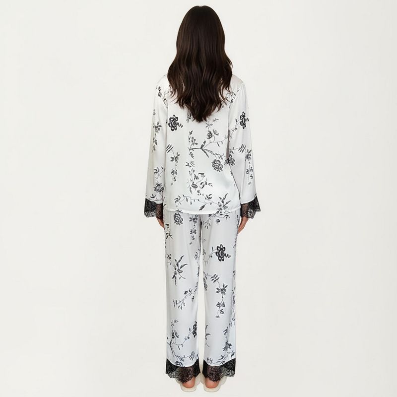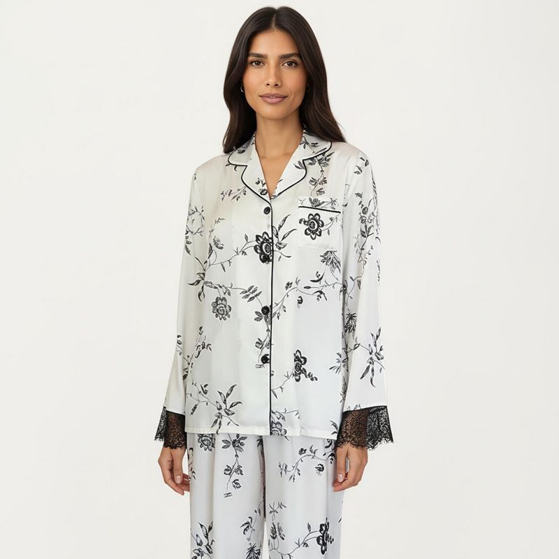 Anna-Kaci Lounge Women's Satin Pajama Set with Floral Print and Lace Trim Cuffs and Hem - Small, Black