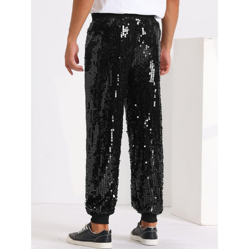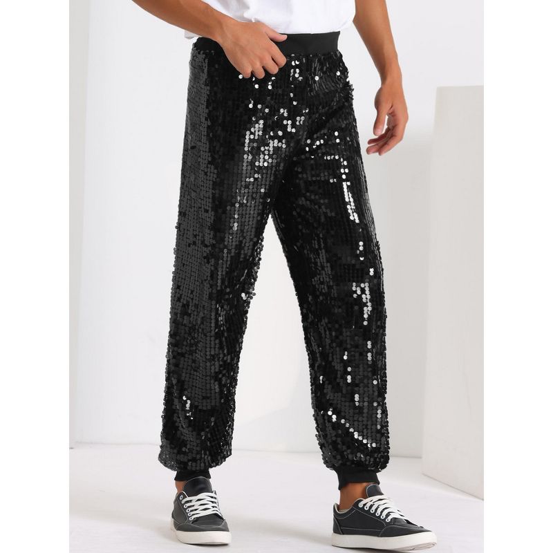 Lars Amadeus Men's Elastic Waist Sparkly Disco Costume Metallic Sequin Joggers Black 32