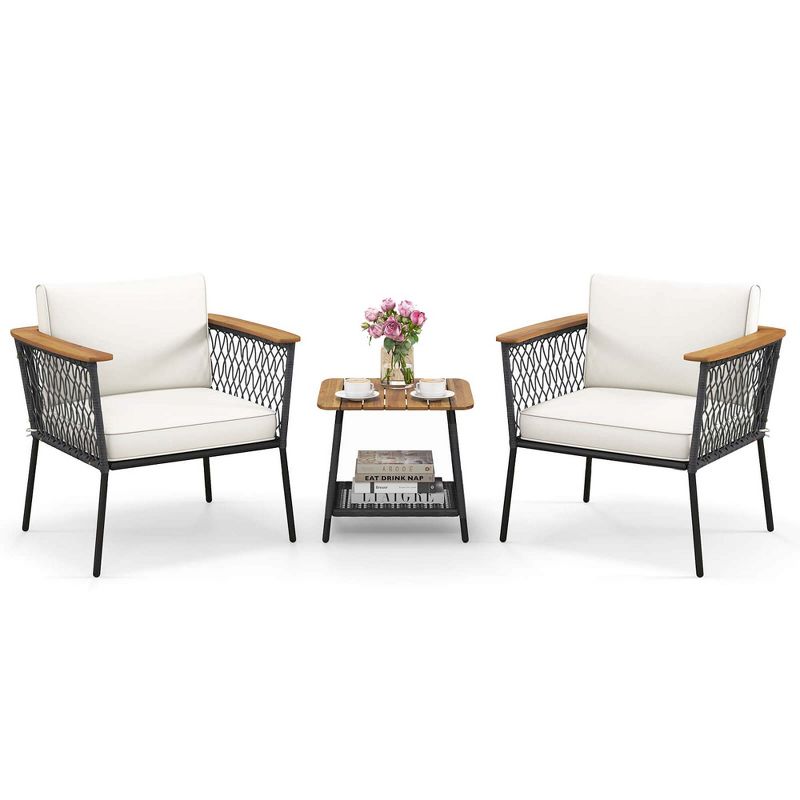 Costway 3 PCS Patio Furniture Set with 2-Tier Coffee Table Acacia Wood Armrests Tabletop