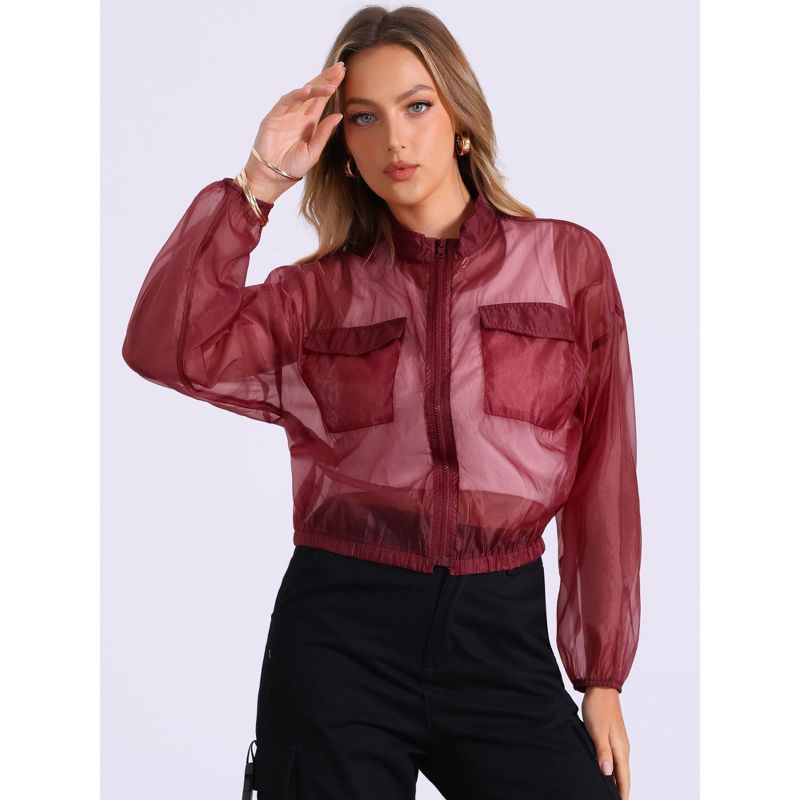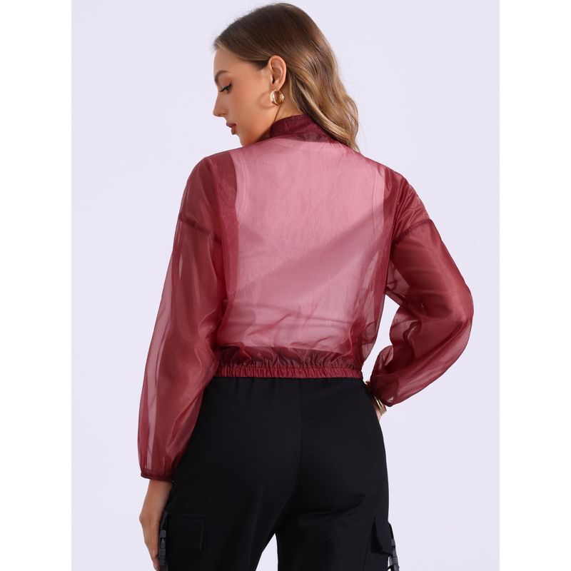 INSPIRE CHIC Women's Zip-Up Long Sleeve See-Through Bomber Jacket Large Wine Red