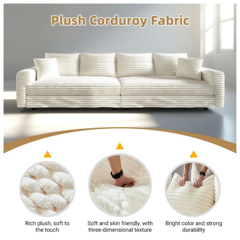 KTMBDW 102.4" Sofa Couch, Comfy Couches for Living Room, Plush Corduroy Sofas for Living Room, Tool-Free Setup Deep Seat Sofa with 3 Ottomans, White