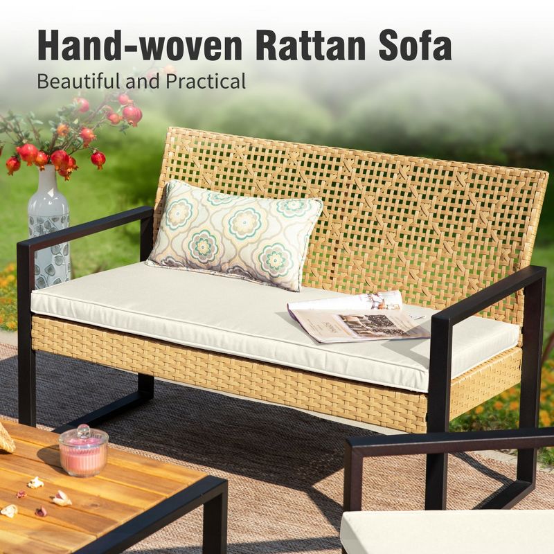 Captiva Designs Outdoor Patio 4 Pieces Wicker Porch Furniture Small Rattan Couch Set with Wood Table for Backyard Brown Rattan Navy Cushion