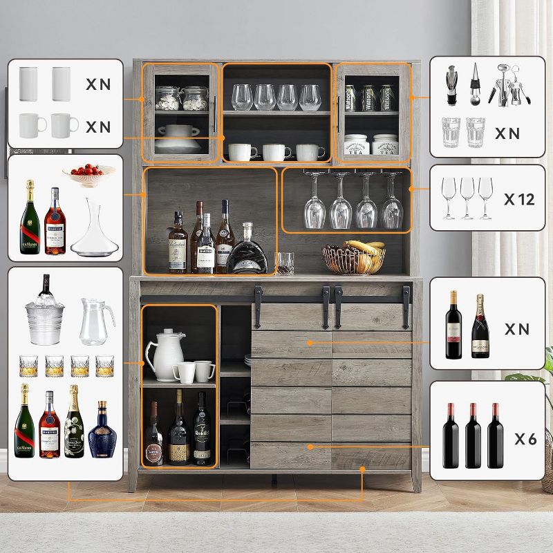 70'' Coffee Bar Cabinet with Storage Hutch and Cup Holder, Tall Kitchen Pantry Cabinet with Sliding Barn Doors, for Home Dining Room, Gray Oak