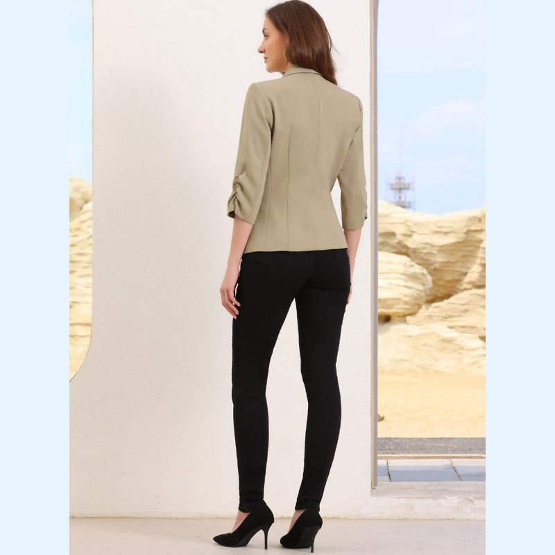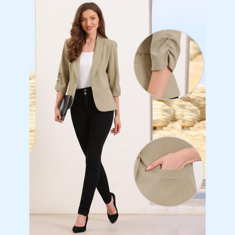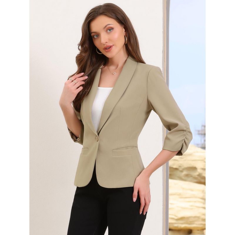 INSPIRE CHIC Women's 3/4 Sleeve Shawl Lapel Pocket Single Button Office Work Blazer Small Khaki