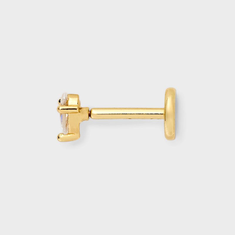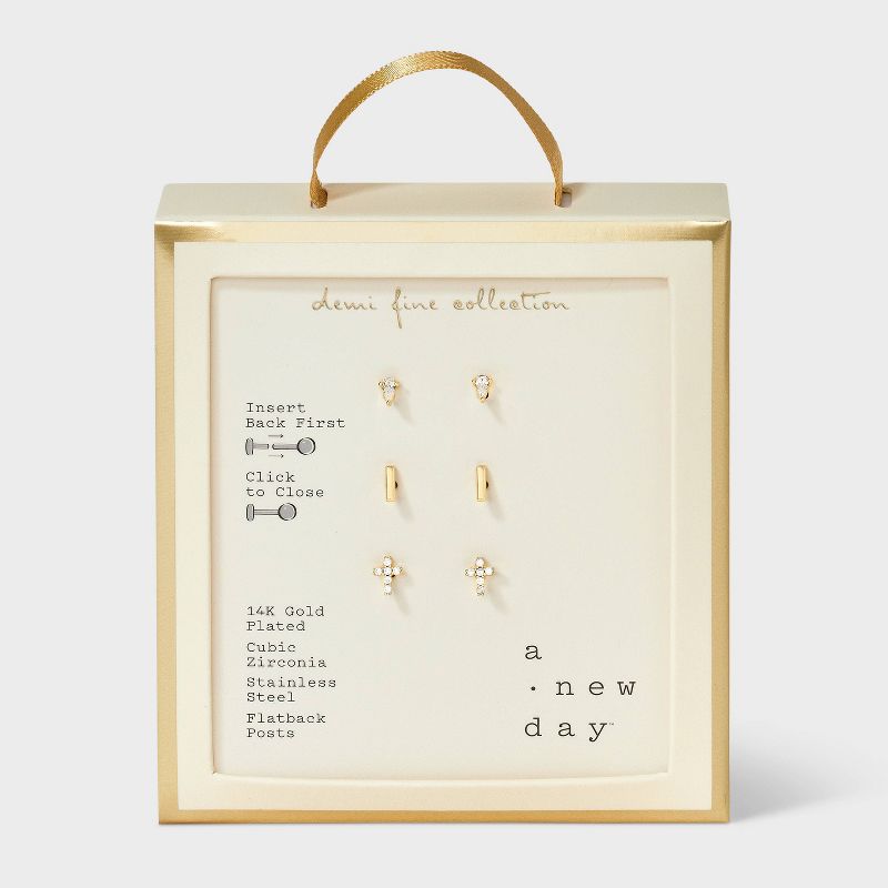 14K Gold Plated Cubic Zirconia Teardrop with Cross and Bar Flat Back Stud Earring Set 3pc - A New Day™ Gold