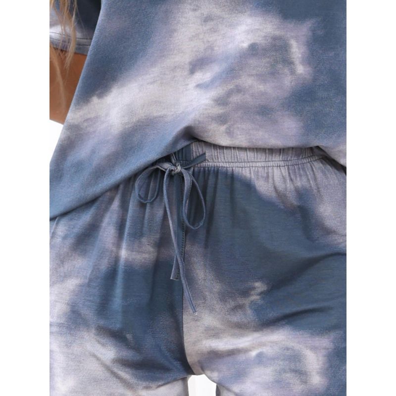 cheibear Women's Tie Dye Pajama Set Short Sleeve Shirt Round Neck 2 Piece Lounge Set Sweatsuit Blue X-Small