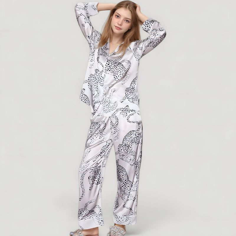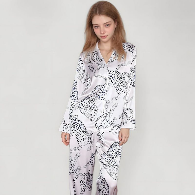 Anna-Kaci Lounge Women's Cheetah Print Woven Pajama Set with Long Sleeve Button Down Top and Relaxed Fit Straight Leg Pants - Small, White