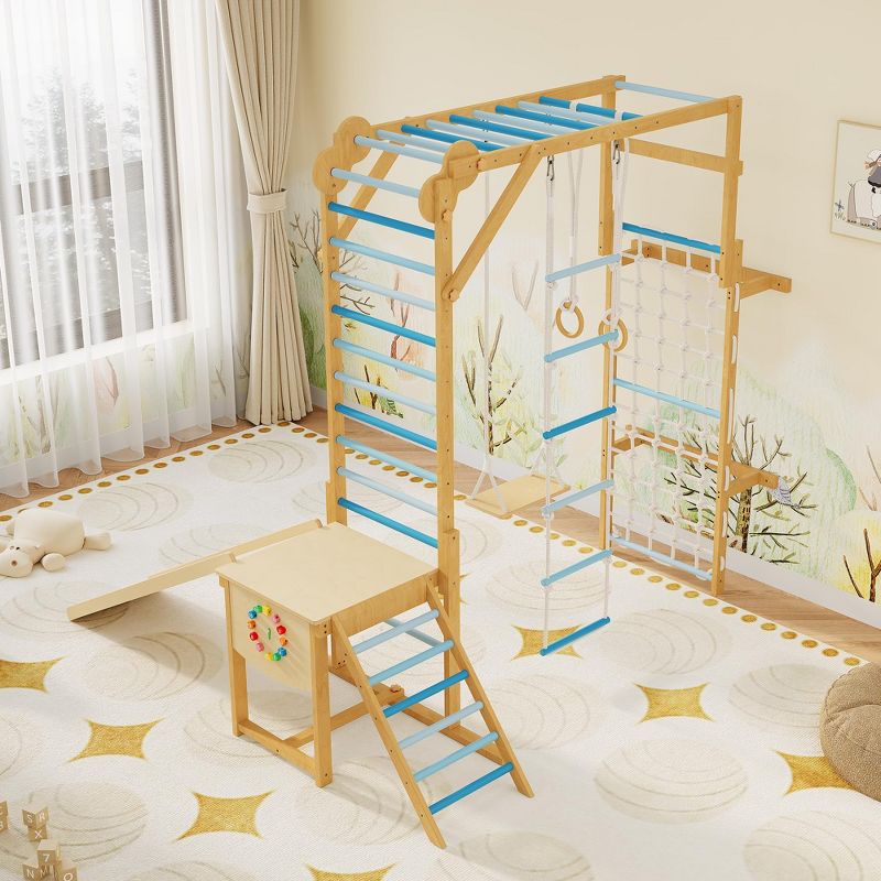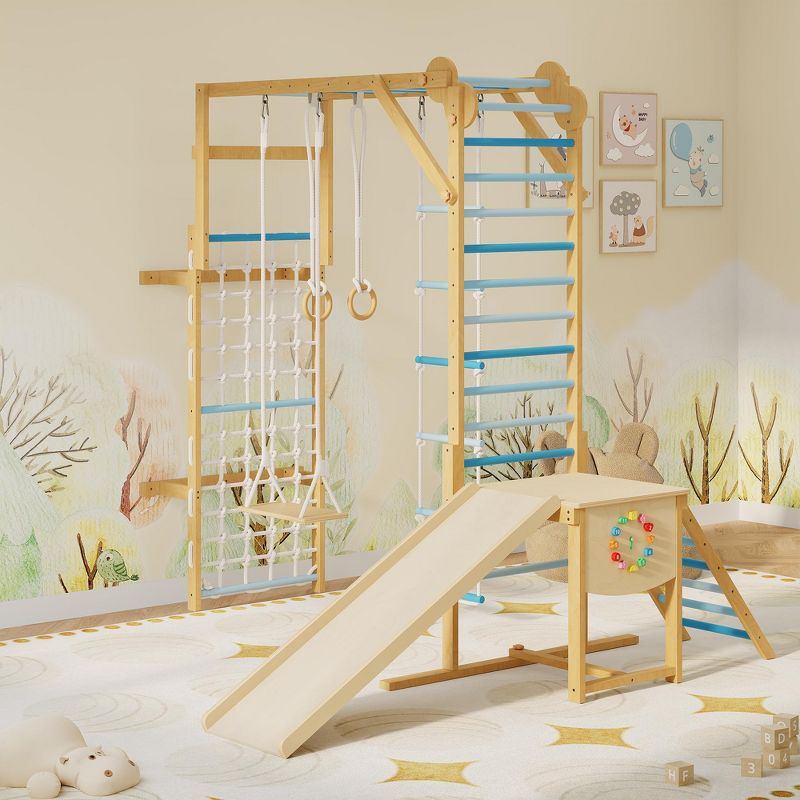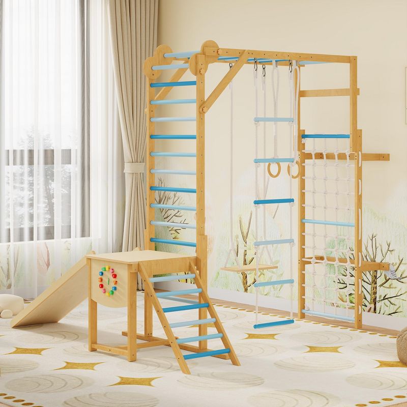 8 in 1 Indoor Jungle Gym for Kids 3-10 with Slide and Swing, Wooden Climbing Frame with Monkey Bars for Home Play