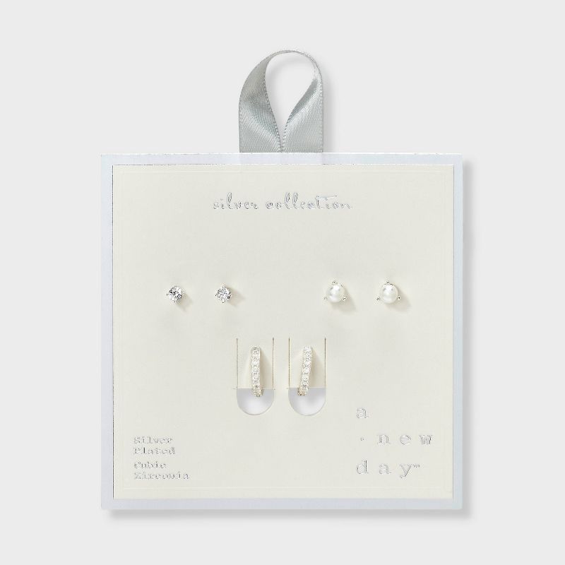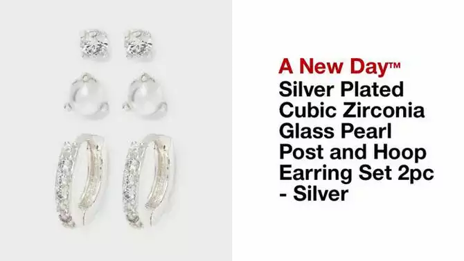 Silver Plated Cubic Zirconia Glass Pearl Post and Hoop Earring Set 2pc - A New Day™ Silver