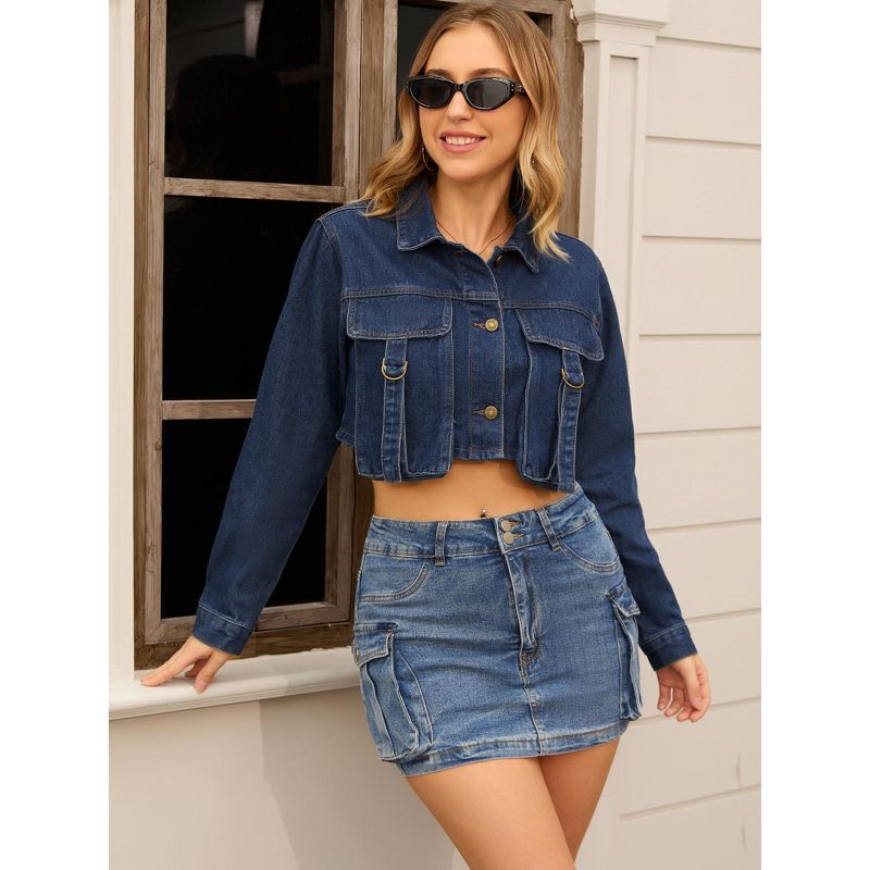 INSPIRE CHIC Women's Crop Turndown Collar Button Down Cargo Pockets Denim Jacket Dark Blue Large