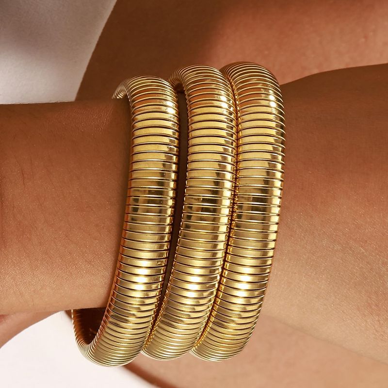 Chunky Stretch Bangles Bracelets 24K Gold Plated Stainless Steel Bracelets Flexible Wide Stack Bracelets 3 Pcs Gold Set-10mm 6.2