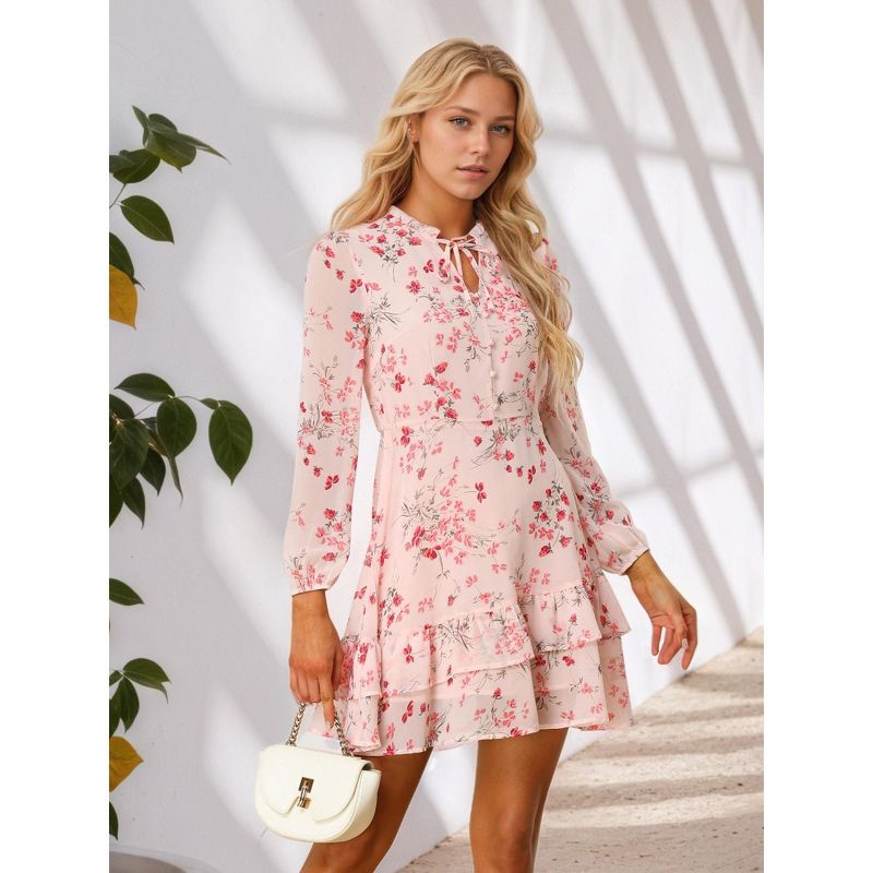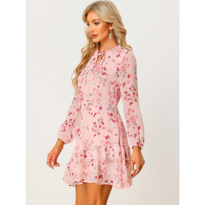 INSPIRE CHIC Women's Summer Floral Layered Tie V-Neck Semi-Sheer Long Sleeve Mini Dress Medium Pink