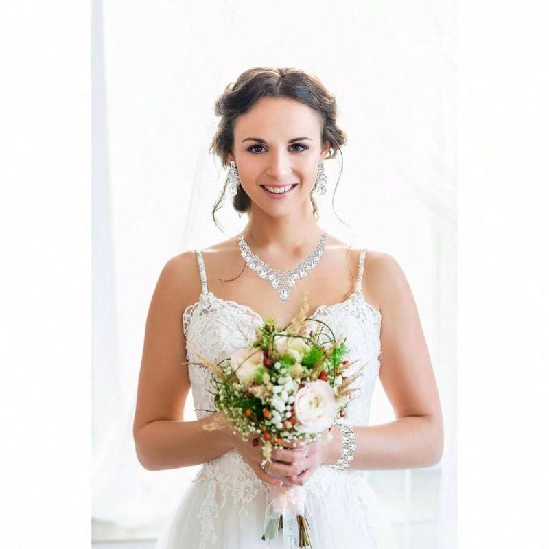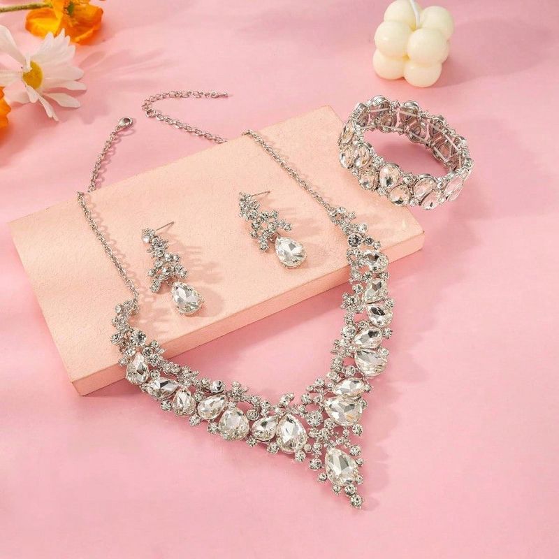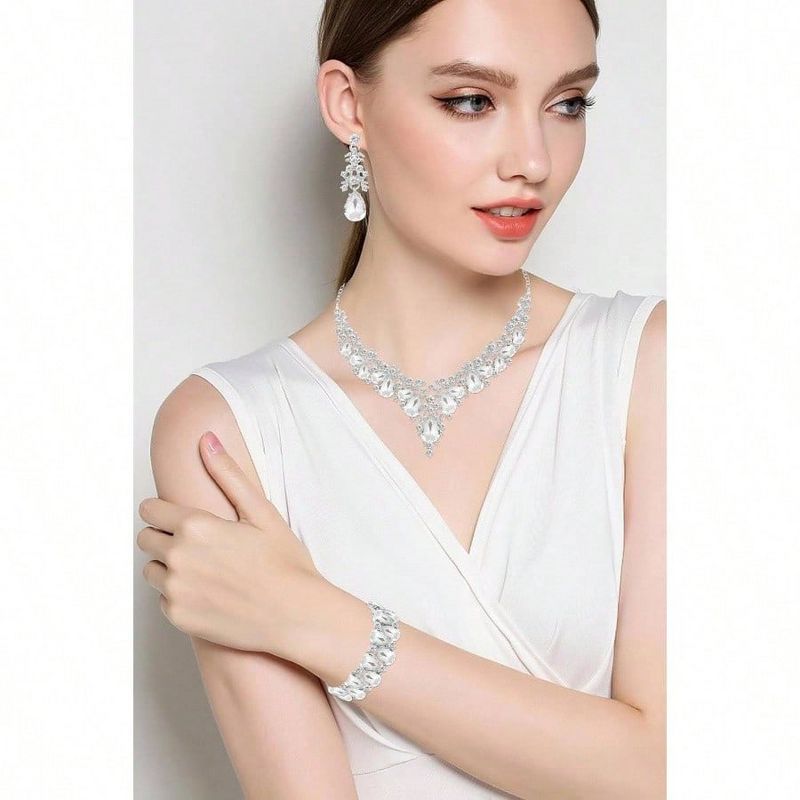 Elegant Teardrop Crystal Leaf Jewelry Set - Necklace, Earrings & Bracelet for Bridal & Formal Occasions Silver Standard