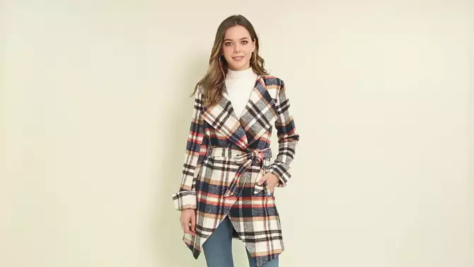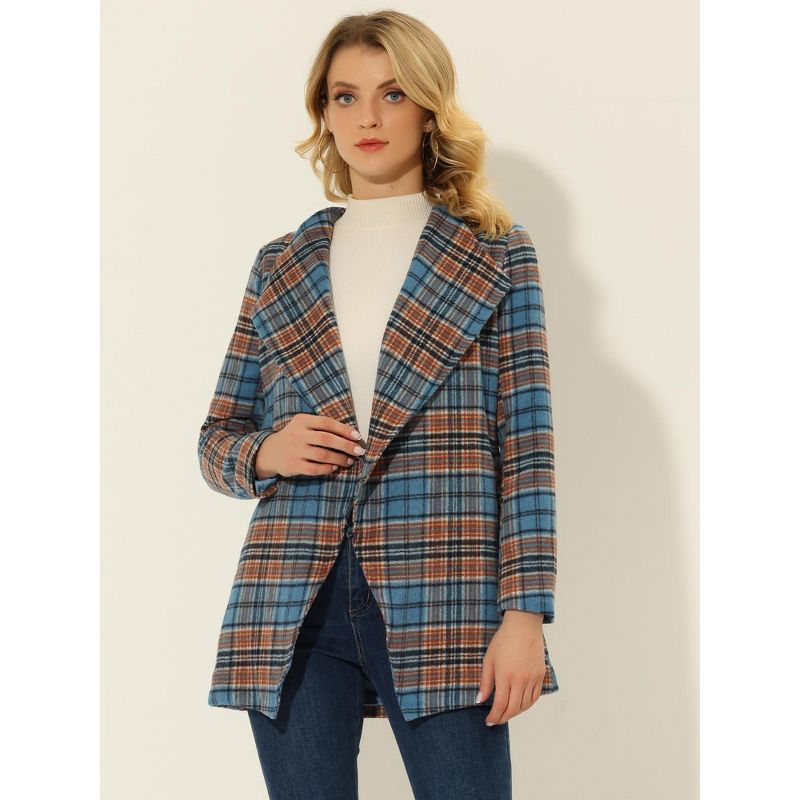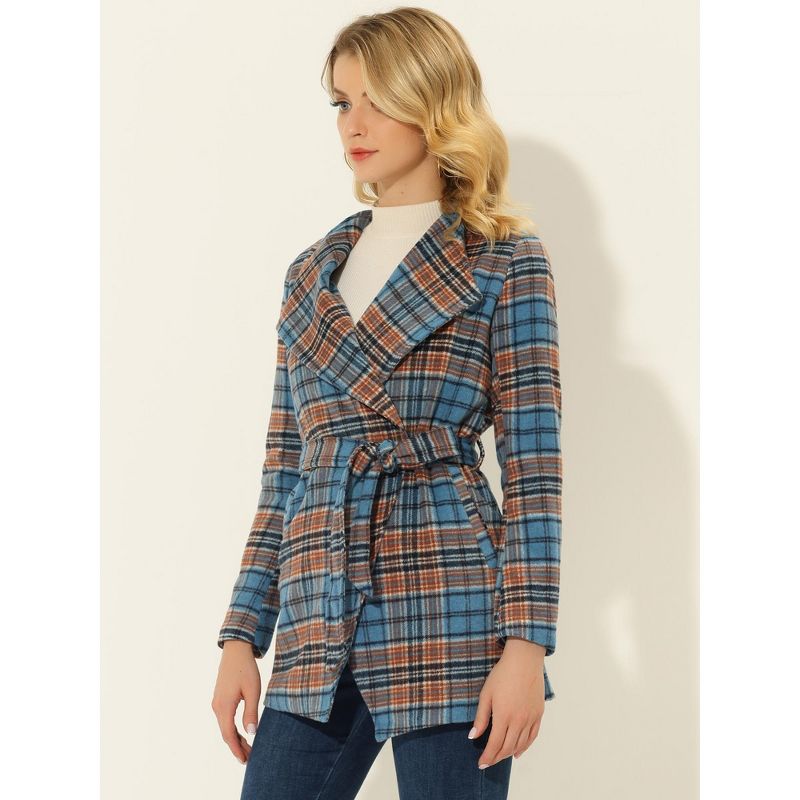 INSPIRE CHIC Women's Shawl Collar Belted Asymmetrical Hem Plaid Coat Blue Large