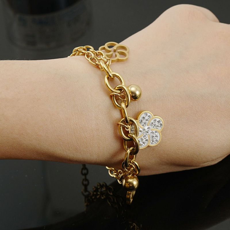 Women's Gold-Tone Clover Charm Bracelet, Adjustable Crystal-Embellished Jewelry for Lucky & Feminine Daily Style