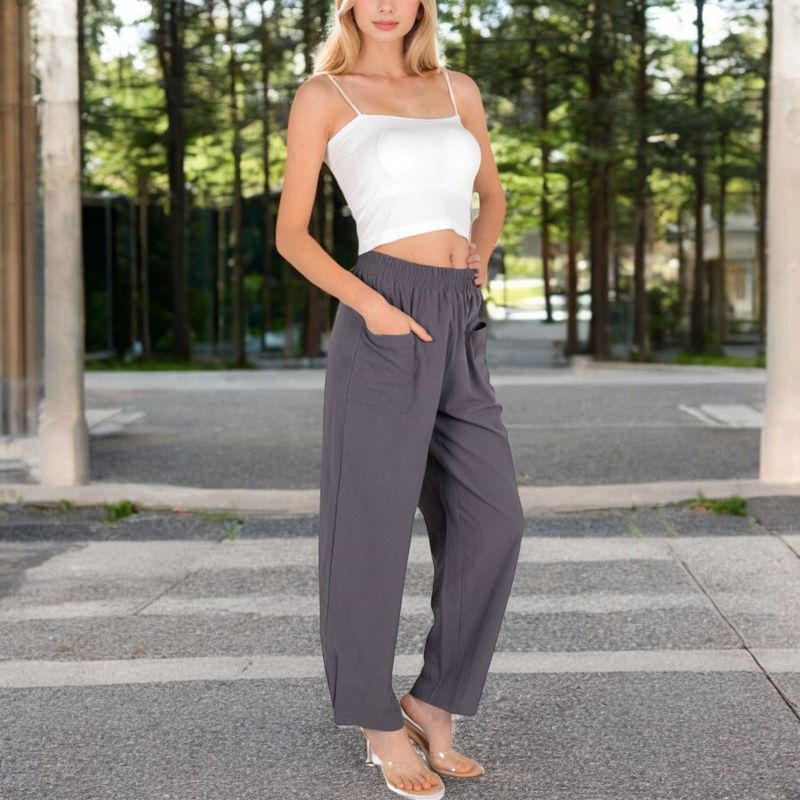 Anna-Kaci Women's Wide-Leg Elastic Waist Design Pants with Side Pockets - Large, Gray