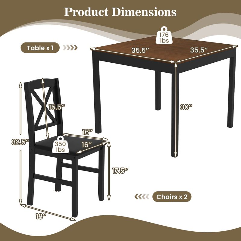 Costway 3 PCS Dining Table Set Wooden Square Kitchen Table with 2 Upholstered Chairs Brown