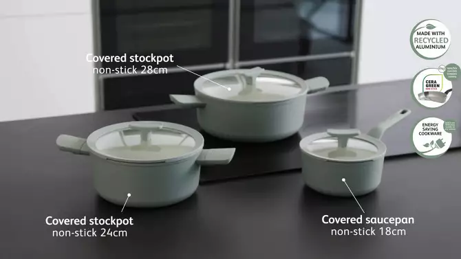 BergHOFF Balance 4Pc Non-stick Ceramic Stockpot and Wok Pan Set With Glass Lids, Recycled Aluminum, CeraGreen, Moonmist