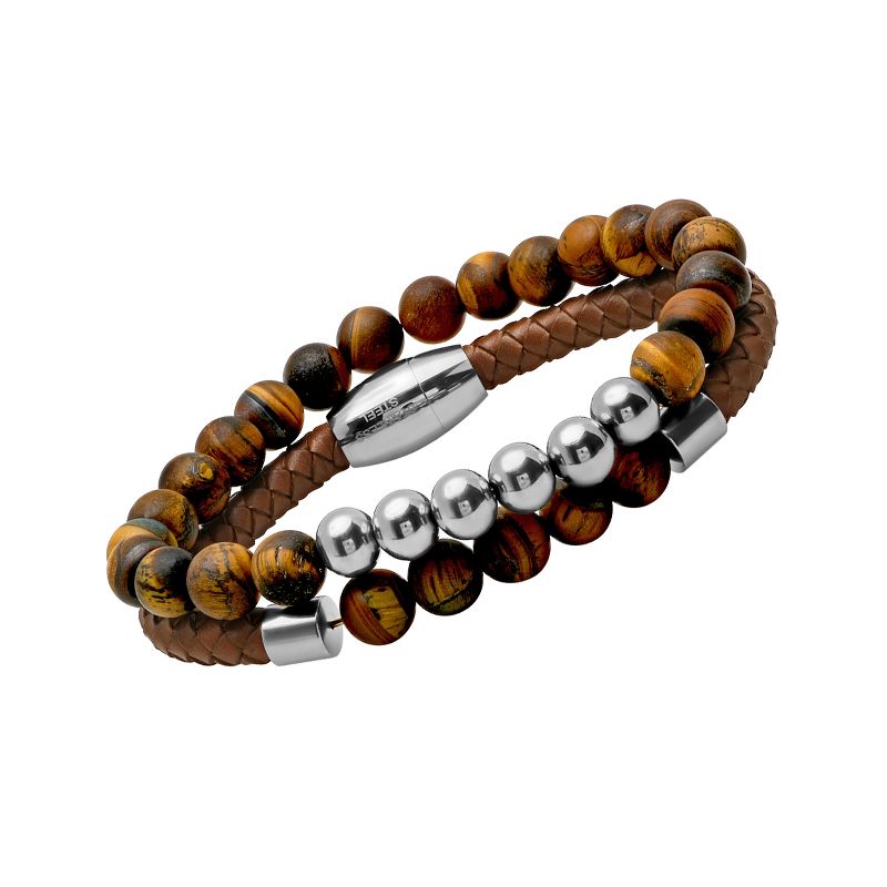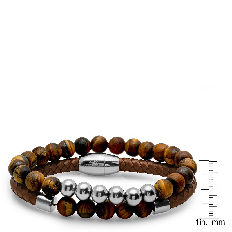 Steeltime Men's set of 2 stainless steel tiger eye beaded and brown leather tiger eye beaded bracelets. Color Options: Silver, Gold