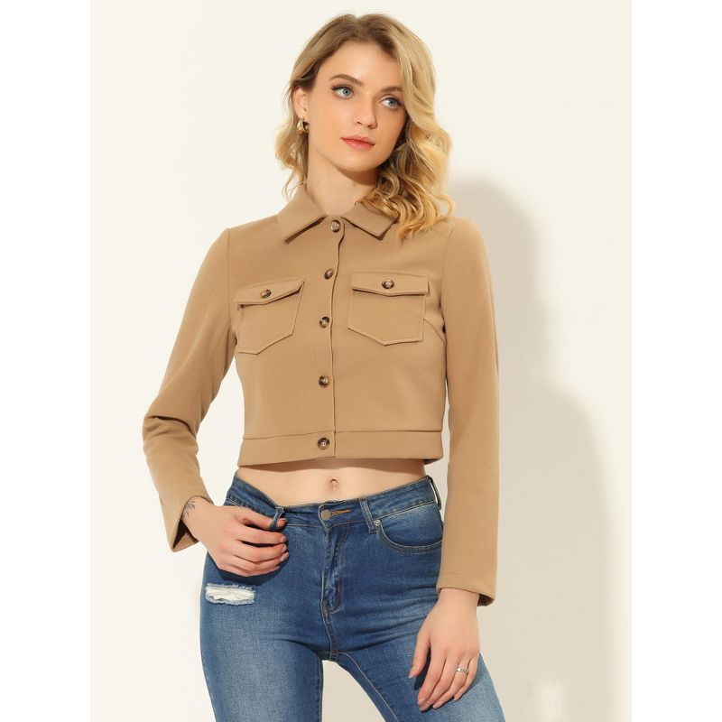 Allegra K Women's Button Front Long Sleeve Crop Shirt Jackets with Pockets Khaki Large