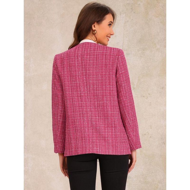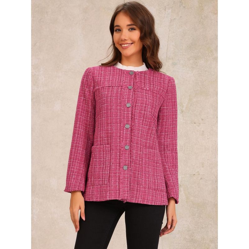 INSPIRE CHIC Women's Single Breasted Collarless Fringed Casual Business Tweed Jacket Pink Medium