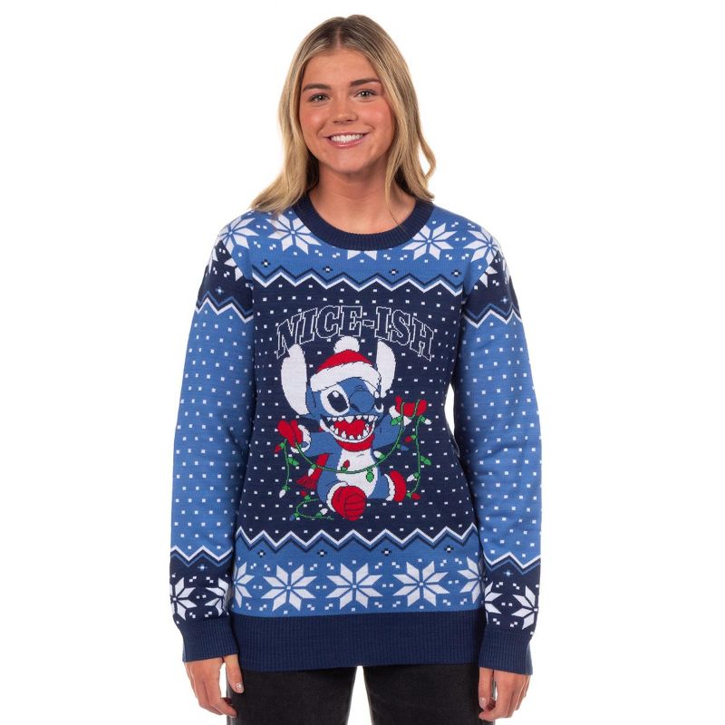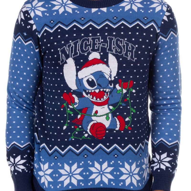 Disney Stitch Men's Nice-Ish Holiday Lights Pullover Ugly Christmas Crewneck Sweater (Large) Multicolored