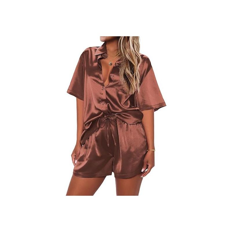 Ekouaer Pajamas for Women Silk Satin Pjs Soft Sleepwear Short Sleeve Button Down Pjs Top and Shorts 2 Piece Lounge Set Black L