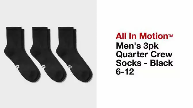 Men's 3pk Quarter Crew Socks - All In Motion™ Black 6-12: Recycled Polyester, Cushioned Heel & Toe