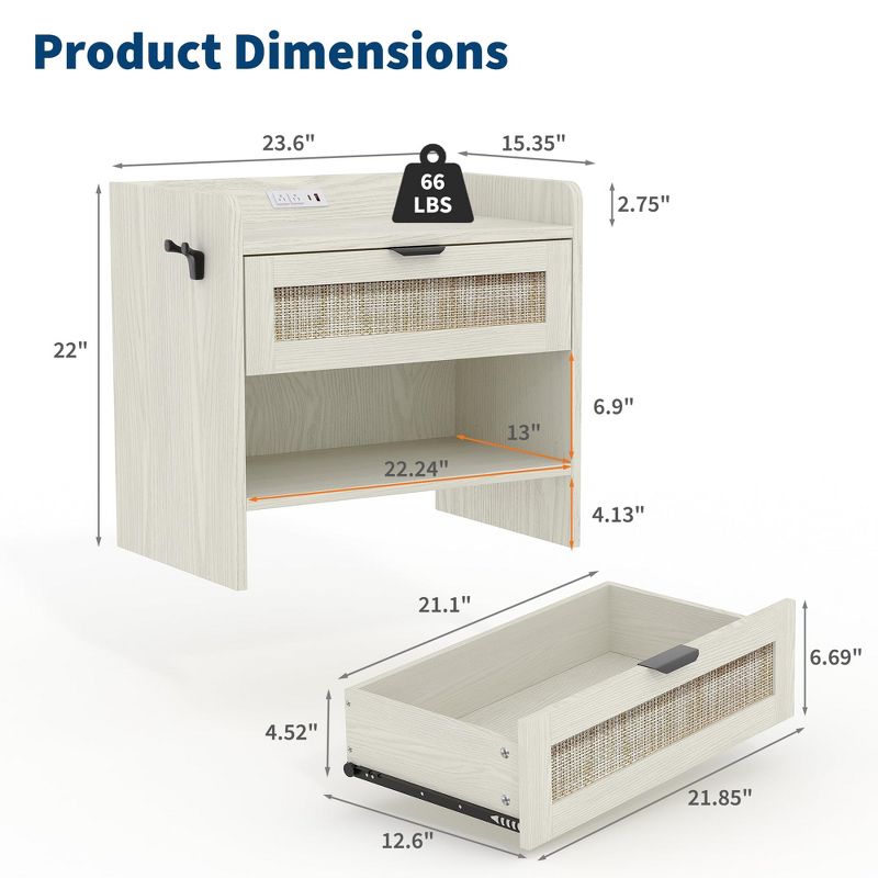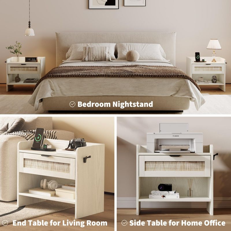 2PCS Wicker Nightstand Set, Boho Bedside Table with Charging Station, Drawer & Open Compartment - Mid-Century Modern Bedroom Furniture