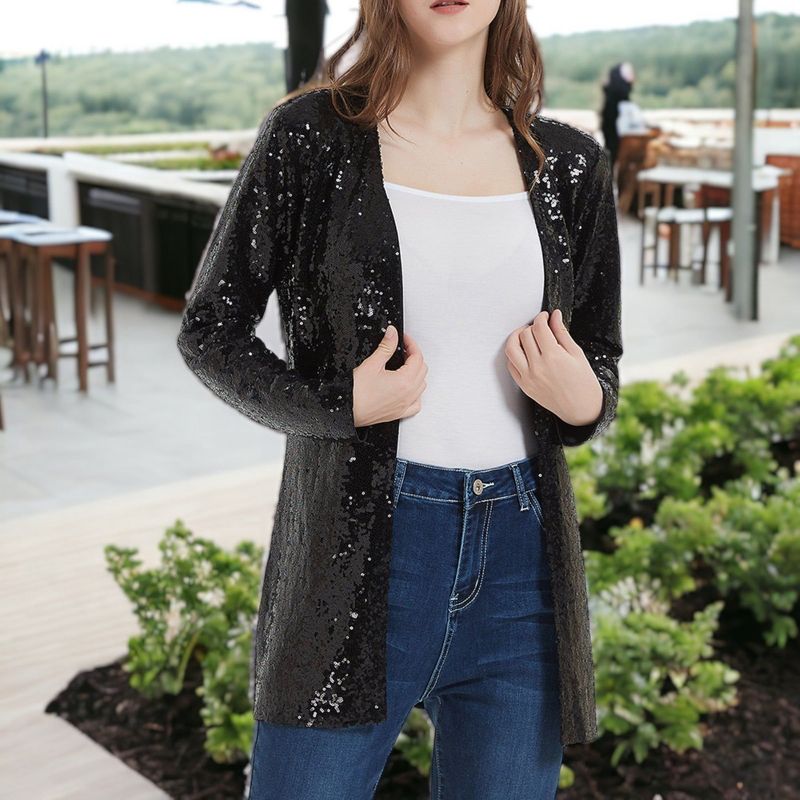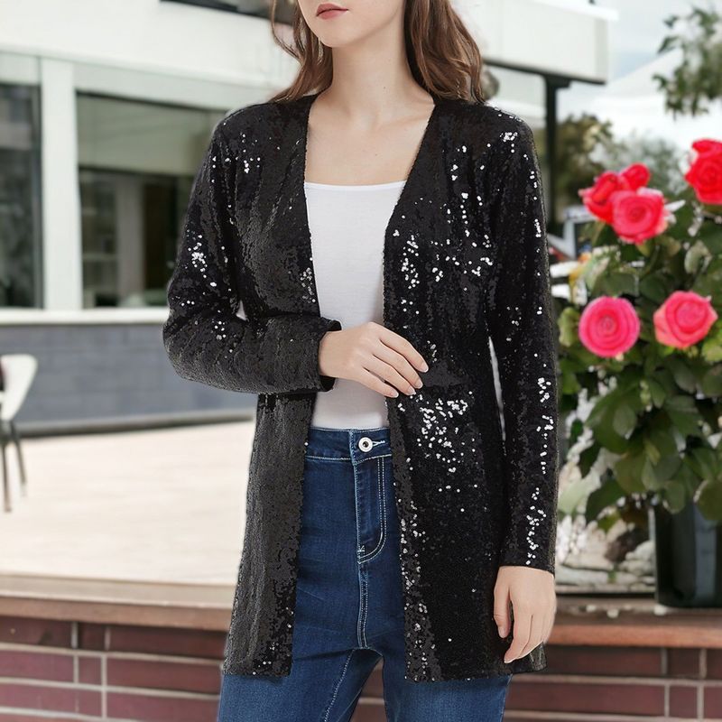 Anna-Kaci Women's Sequin Fashion Jacket Open Front Coat Blazer Party Cocktail Outerwear Cardigan- Medium, Black