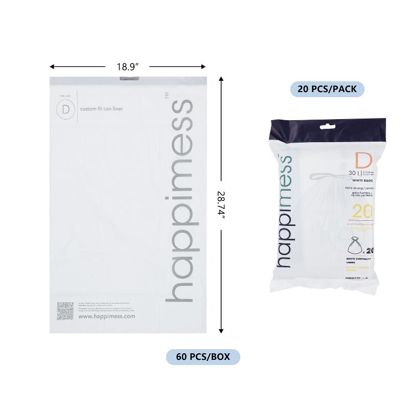 happimess 8-Gallon (30L) Drawstring Unscented Slim Trash Can Liner, White (60-Count, 3-Packs of 20 Liners)