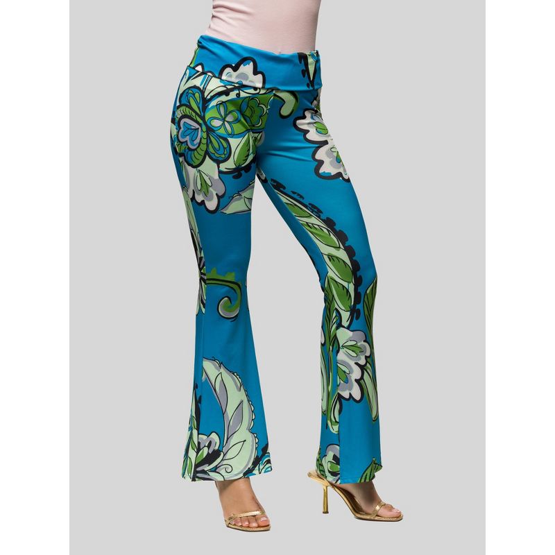 24seven Comfort Apparel Womens Teal Paisley Print Bell Bottom Foldover Waist Pants