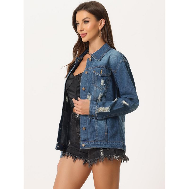Allegra K Women's Long Sleeve Ripped Distressed Jean Jackets Blue Small
