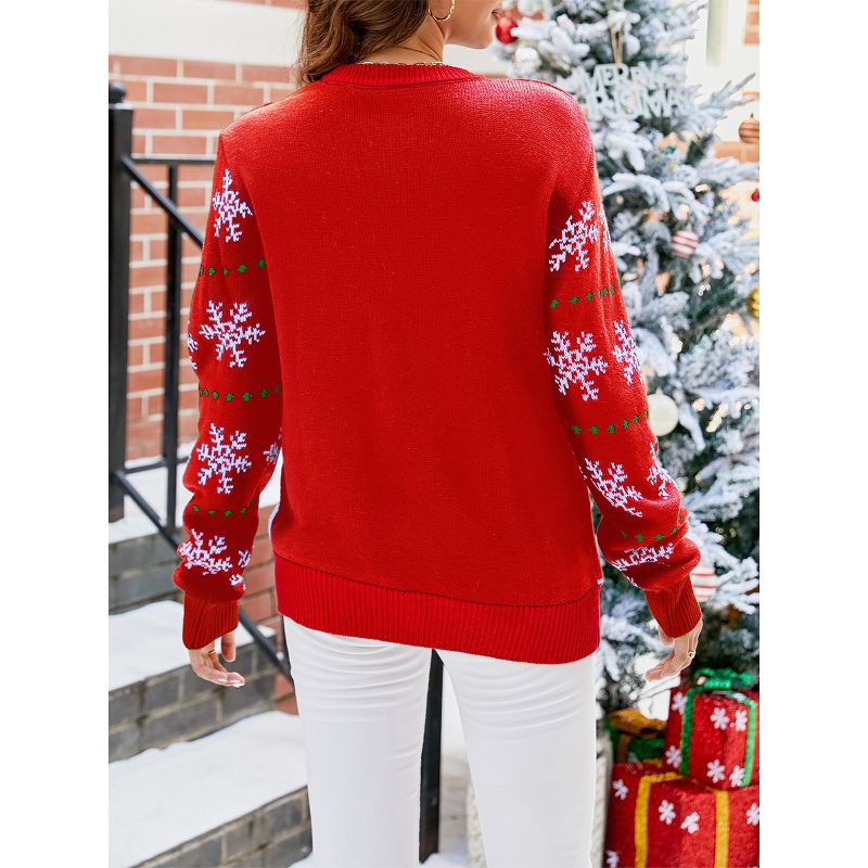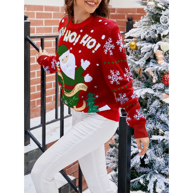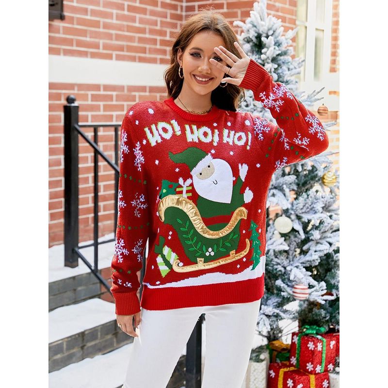 Womens Ugly Christmas Sweater Crew Neck Pullover Sweaters Jacquard Knit Festive Pattern Christmas Sweater Ho Ho Ho Santa Sweater, Red - 2XL